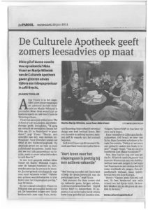 Naar aanleiding van het speciale spreekuur vakantieboeken in Cafe Brecht op 19 juli, schreef het Parool een artikel over de Culturele Apotheek. Over de aanpak van ons persoonlijk leesadvies, en over vakantieboekentips voor reizigers en thuisblijvers. Het artikel als pdf openen kan hier: CultureleApotheek_Parool_20-07-2011.