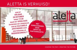Aletta, het instituut voor vrouwengeschiedenis is verhuisd en viert dat met een feestelijke opening op 28 oktober. De Culturele Apotheek maakt bezoekers op de open avond op een speelse manier wegwijs in de collectie. Lucht je hart tijdens ons speciale spreekuur voor damesleed, mannenklachten en ander onbehagen en ontvang je eigen persoonlijke boekenrecept, direct in te wisselen bij de uitleenbalie van Aletta.