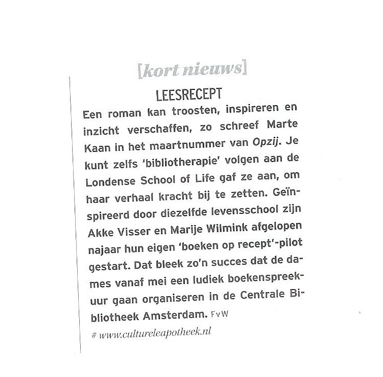 In de Opzij van maart 2011 stond een prachtig artikel over de kracht van literatuur. Naar aanleiding daarvan kwam er een bericht over het persoonlijk leesadvies van de Culturele Apotheek in de Opzij van mei 2011.