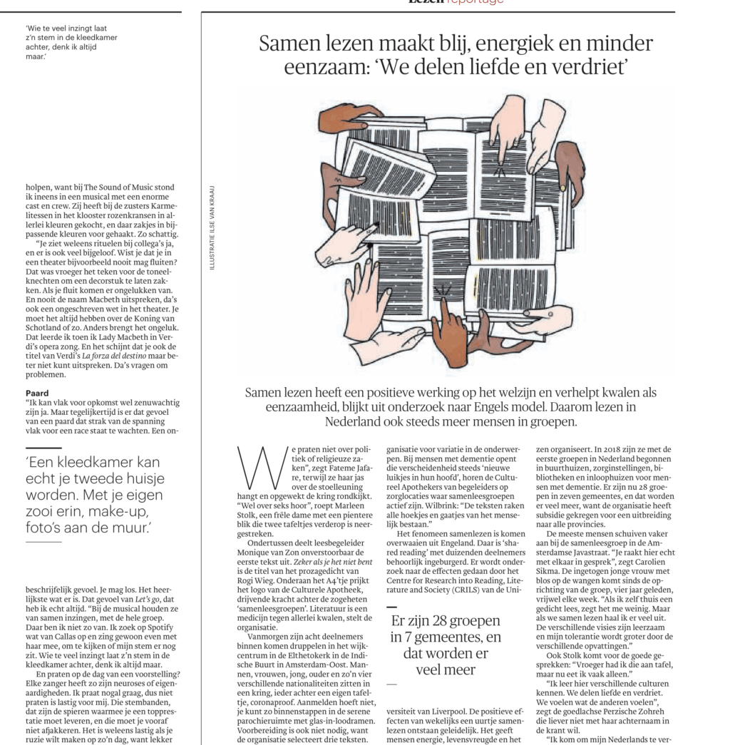 Begin 2018 organiseerden we voor het eerst een samenleessessie, in buurthuis Eltheto in Amsterdam-Oost. Dat leverde meteen zo’n prachtige, impactvolle ontmoeting tussen buurtgenoten op, dat we daarna in volle vaart op meer plekken samenleesgroepen zijn gaan starten. De samenleesgroep in Eltheto kwam meer dan 6 jaar lang elke week bij elkaar. Trouw maakte er in 2022 een reportage over onder de kop ‘Samen lezen maakt blij, energiek en minder eenzaam’.